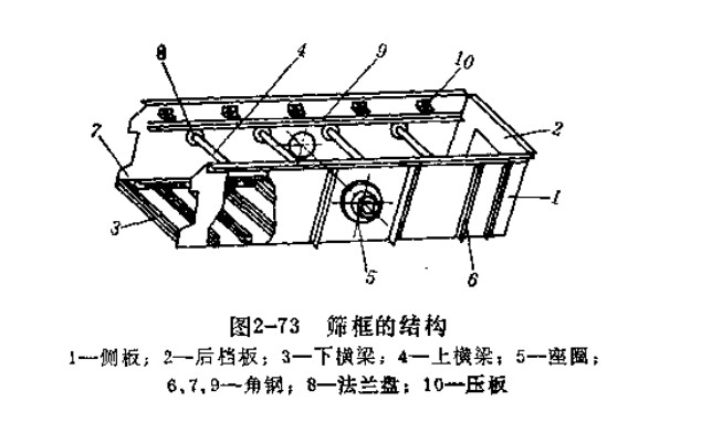 圖2-73是雙層單軸慣性振動(dòng)篩的篩框結(jié)構(gòu)。它是由側(cè)板1、后擋板2、下橫梁3和上橫梁4組合而成。側(cè)板是用鋼板制成,利用橫梁將兩塊側(cè)板連接起來(lái),使篩框成整體結(jié)構(gòu)。側(cè)板用以傳遞激振力,在它的中部,鉚接有座圈5,激振器就安裝在座圈內(nèi)。為了加強(qiáng)側(cè)板的剛度,在座圈附近采用雙層的鋼板,并在適應(yīng)部位鉚接角鋼6以補(bǔ)強(qiáng)。下橫梁采用槽鋼,上橫梁用無(wú)縫鋼管,并用角鋼7和法蘭盤8分別鉚接在側(cè)板上。上層篩面放置在側(cè)板內(nèi)側(cè)的角鋼上,并用壓板10和木楔塊將它固緊。下層篩網(wǎng)放置在下橫梁上,用卡板拉緊(圖2-77)。后擋板中間有能拆卸的后蓋板,供清洗或檢查篩面用。