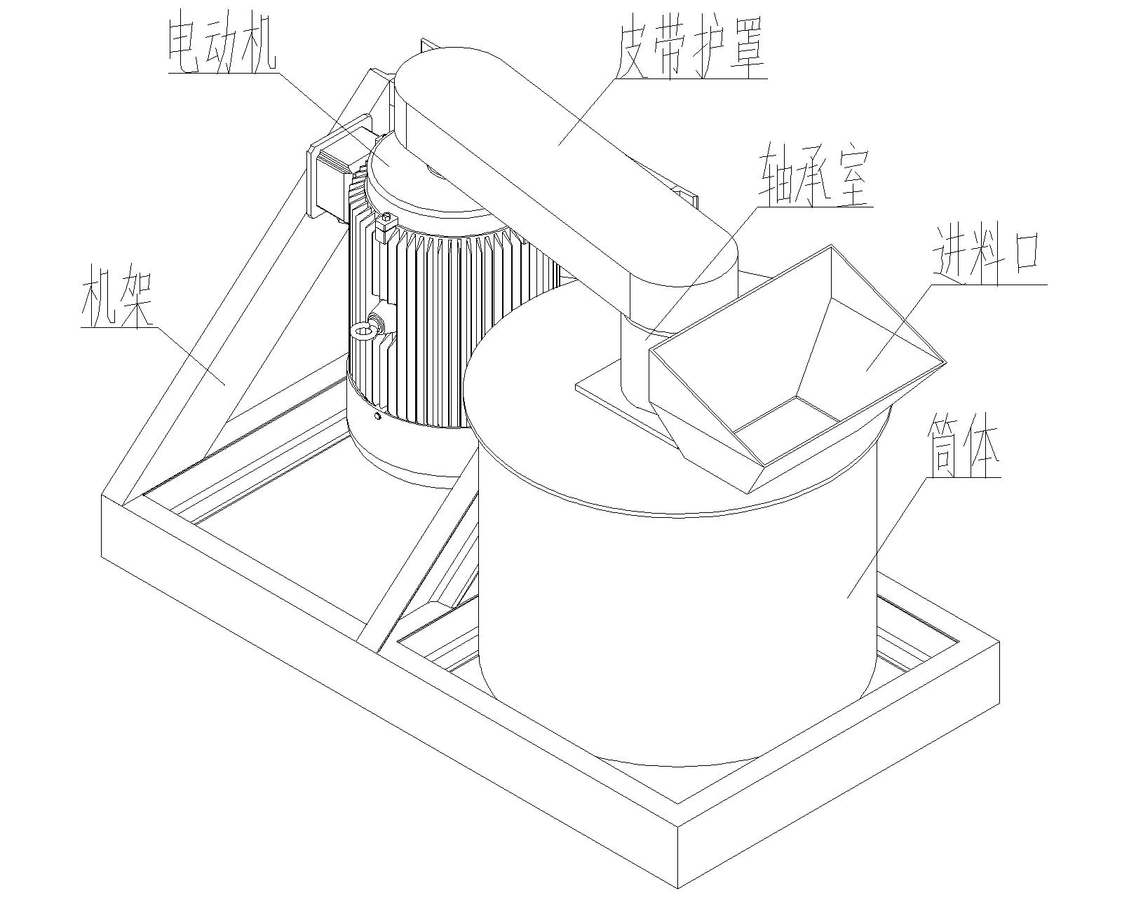 構(gòu)造組成:結(jié)構(gòu)由下機(jī)架、機(jī)殼、上下軸座、主軸、轉(zhuǎn)子盤、鏈條、錘頭、皮帶輪、電機(jī)架等部份組成。動(dòng)力經(jīng)三角帶帶動(dòng)主軸旋轉(zhuǎn),主軸有上下兩個(gè)軸承座,軸承座安裝在機(jī)殼的上端和下端。機(jī)殼總成安裝在下機(jī)架上,主軸上裝有轉(zhuǎn)子盤和鏈條,加料斗裝在機(jī)殼上部,為了裝卸錘頭方便,機(jī)殼上開有活門,便于拆裝維修。